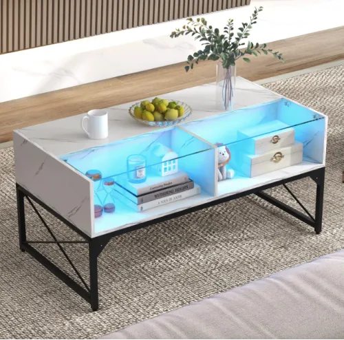 Цей журнальний стіл з підсвіткою обладнаний вбудованим LED-освітленням, яким можна керувати за допомогою пульта. Обирайте серед 20 статичних кольорів, 22 динамічних режимів, налаштовуйте яскравість (5 рівнів) та швидкість анімації (10 рівнів). Змінюйте атмосферу кімнати за секунду - від романтичної до футуристичної.
